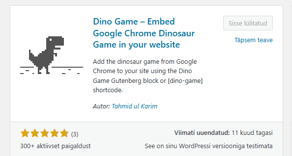 Minu valitud plugin on populaarne Dino mäng, mida saab mängida.